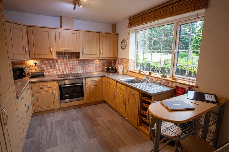 This is an end of terrace cottage. Downstairs there is a spacious lounge/dining area with electric woodburner-effect stove, and patio doors leading to a paved area with forest views that is ideal for morning coffee or an evening drink. There is a well equipped fitted kitchen with breakfast bar, and a utility room plus extra WC.